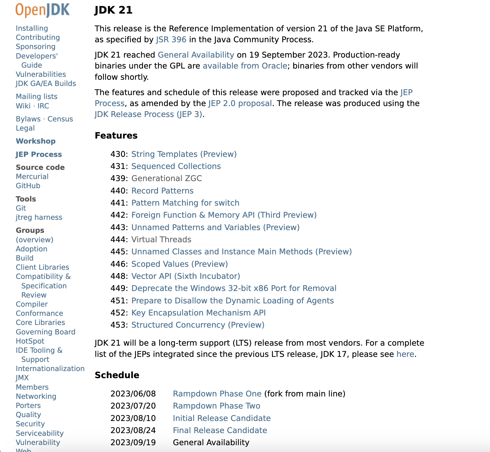 Java 21 / JDK 21 已正式 GA,这个版本是JDK 17 后的长期支持版本 (LTS),Oracle 将为其提供至少八年的技术支持和更新。